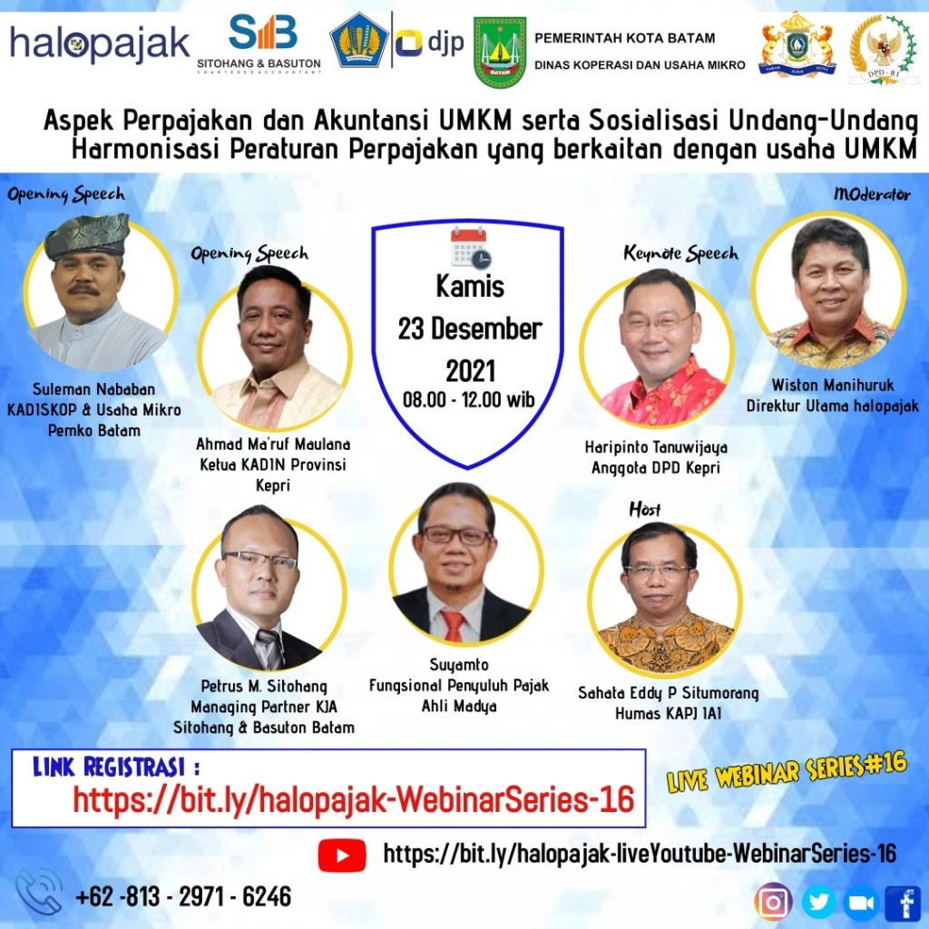 Kantor Jasa Akuntan Sitohang Dan Basuton bekerja sama dengan Halo Pajak, Direktorat Jenderal Pajak Kanwil Kepulauan Riau, Pemko Kota Batam dan KADIN Kepulauan Riau akan menyelenggarakan webinar bertema “Aspek Pepajakan dan Akuntansi UMKM serta Sosialisasi Undang-Undang Harmonisasi Peraturan Perpajakan yang berkaitan dengan usaha UMKM”. Webinar ini akan diselenggarakan pada: