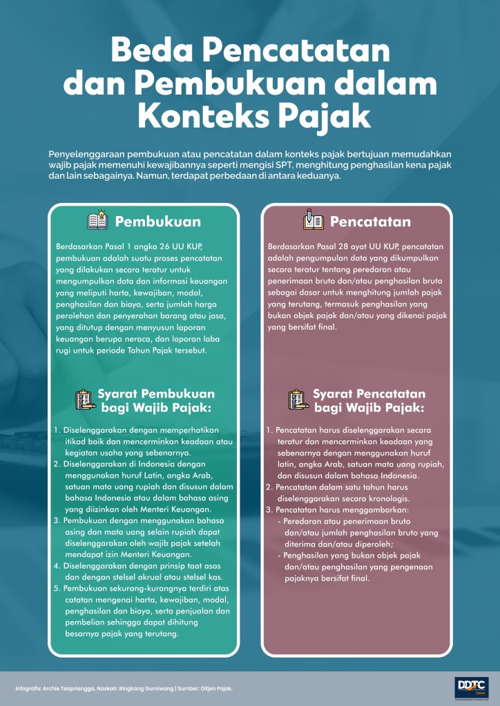Pembukuan adalah suatu proses pencatatan yang dilakukan secara teratur untuk mengumpulkan data dan informasi keuangan yang meliputi harta, kewajiban, modal, penghasilan dan biaya, serta jumlah harga perolehan dan penyerahan barang atau jasa, yang ditutup dengan menyusun laporan keuangan berupa neraca, dan laporan laba rugi untuk periode Tahun Pajak tersebut.