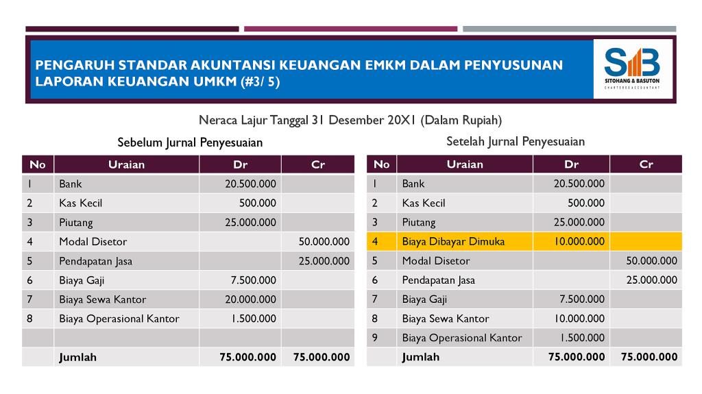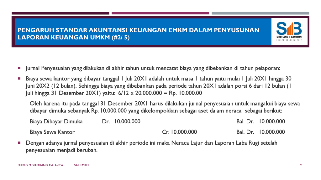 Berikut adalah contoh pencatatan satu transaksi yang dapat menghasilkan laporan keuangan yang berbeda: pencatatan sewa gedung untuk masa sewa 1 tahun di pertengahan tahun periode laporan (dibayar di tanggal 1 Juli 20×1 untuk masa sewa sampai 30 Juni 20X2) dengan jumlah Rp. 20.000.000. Yang sesuai SAK EMKM yang diterbitkan IAI adalah setelah dilakukan penyesuaian.
