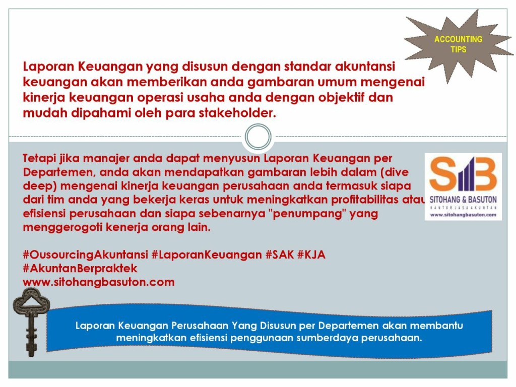 Untuk itu maka sistim akuntansi yang baik saat ini pada umumnya menyediakan fitur untuk pelaporan keuangan berdasarkan departemen atau cabang. Dengan sistim pelaporan berdasarkan departemen atau cabang para Direktur atau GM akan dapat mengetahui kinerja tiap manajer sehingga diketahui siapa yang bekerja efisien dan pencetak laba dan siapa yang tidak. Dari situ akan diketahui mana area yang perlu dipertahankan, mana yang perlu perbaikan dan siapa manajer yang harus diganti agar tidak menjadi beban bagi perusahaan.